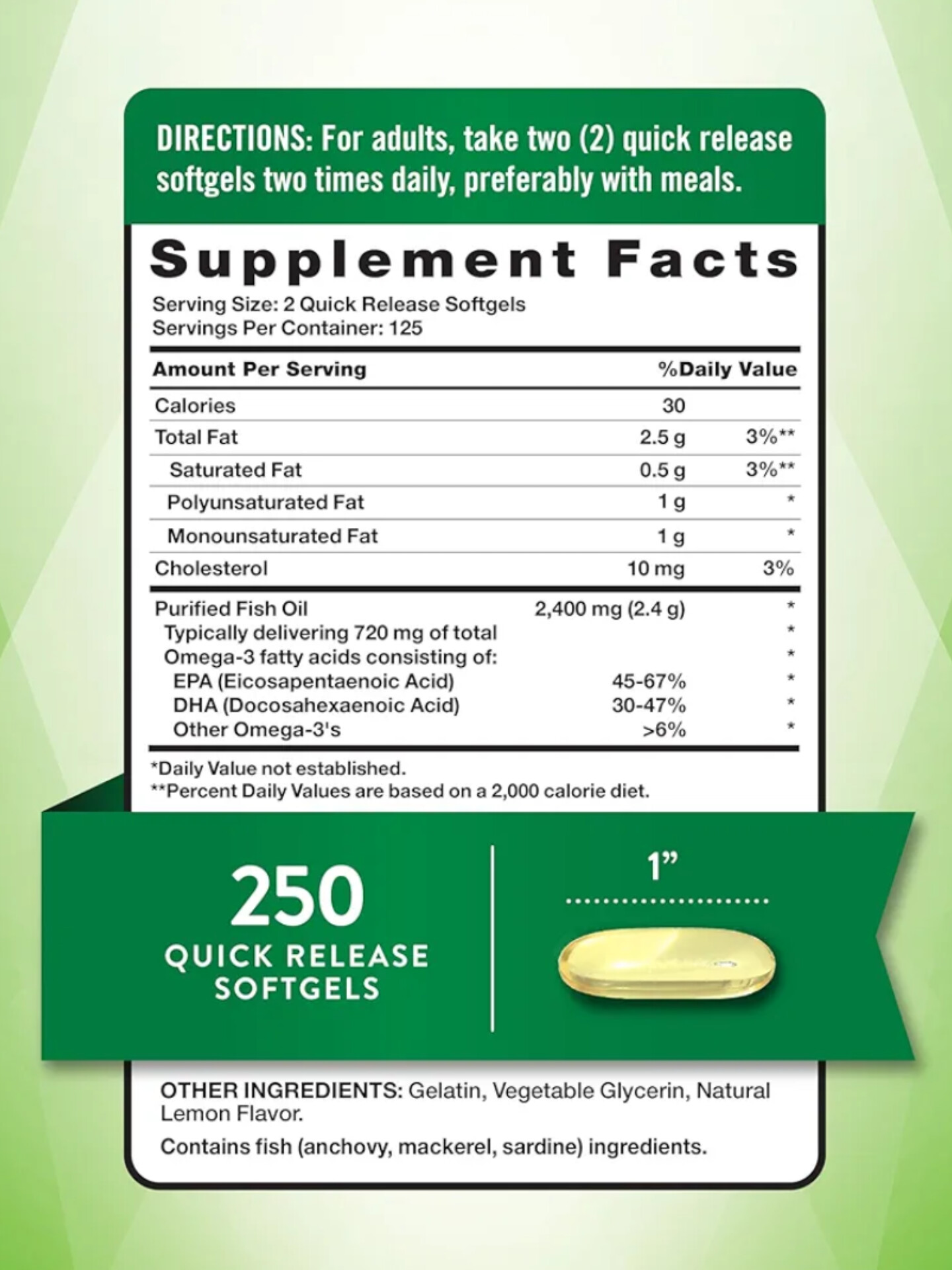 بهترین مواد در هر ویتامین و مکمل Nature’s Truth® وجود دارد. این ژل های نرم 2400 میلی گرمی روغن ماهی غیر GMO هستند و فاقد گلوتن، گندم، مخمر، شیر، لاکتوز، رنگ های مصنوعی، طعم دهنده ها، شیرین کننده ها و مواد نگهدارنده هستند.