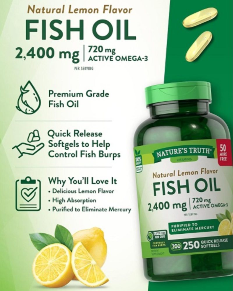 روغن ماهی نیچرز تریث Nature’s Truth Fish Oil به گونه ای فرموله شده است که حاوی 360 میلی گرم اسیدهای چرب امگا 3 (EPA و DHA) در هر کپسول باشد که ممکن است به کاهش خطر بیماری قلبی عروقی کمک کند.