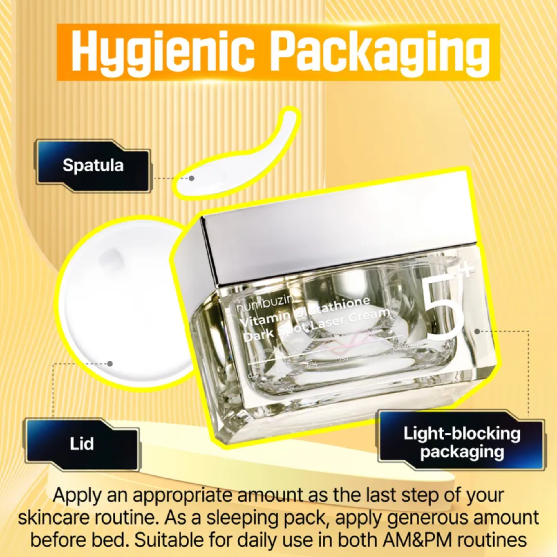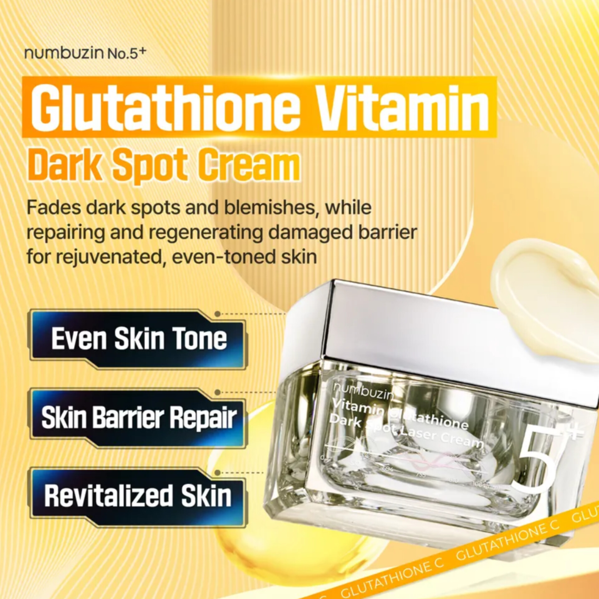 کرم لیزر ویتامین گلوتاتیون نامبوزین شماره 5 (numbuzin – No. 5 Vitamin Glutathione Dark Spot Laser Cream)، با فرمولاسیون پیشرفته و ترکیبات قدرتمند، به عنوان یکی از بهترین گزینه‌ها برای روشن کردن پوست و رفع لک‌های تیره شناخته می‌شود.